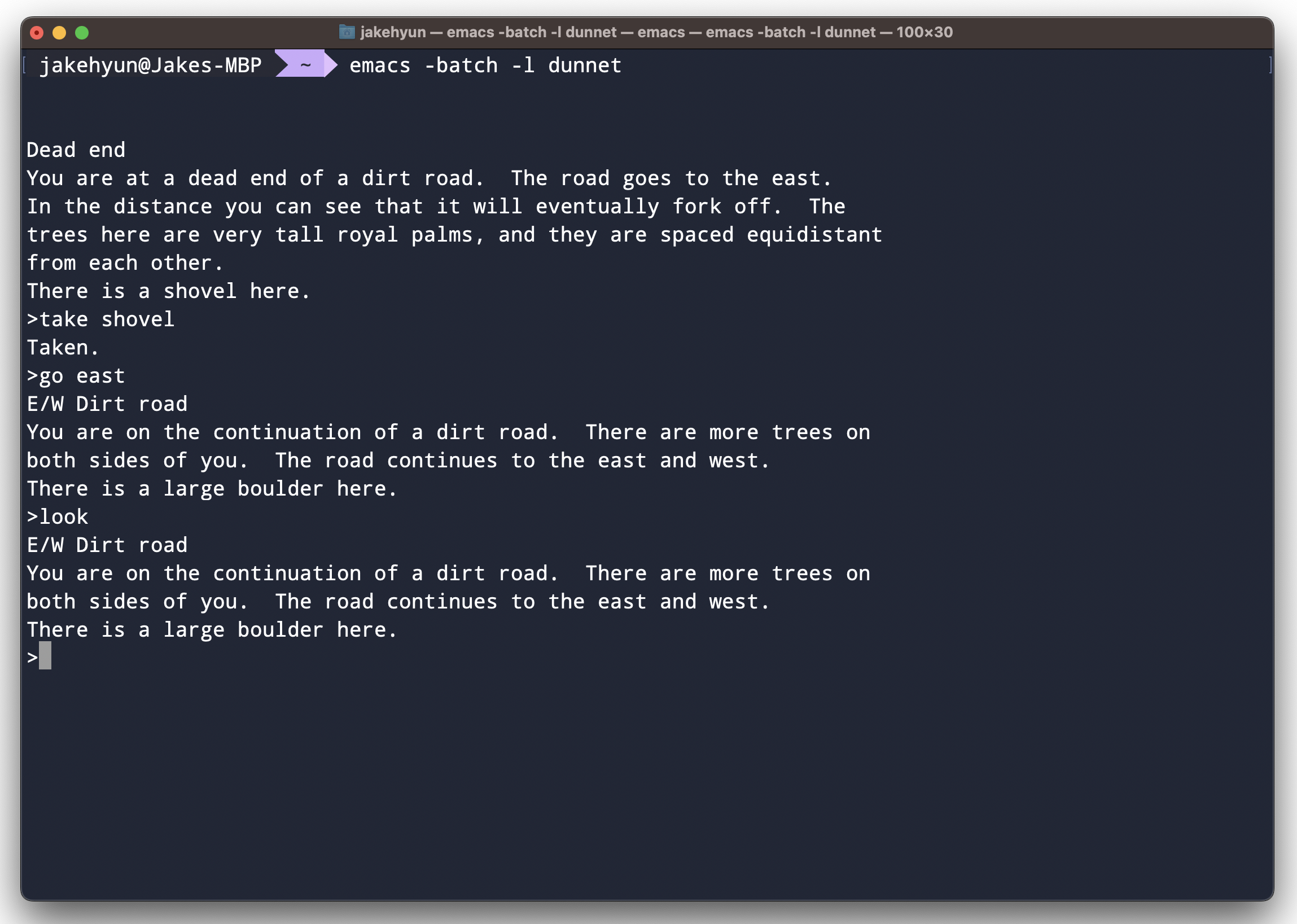 간단한 소인수분해 프로그램, $\pi$값 계산 프로그램 등을 매일 만들다가... 어느 날 갑자기 맥 터미널에서 Dunnet이라는 90년대 텍스트 어드벤처 게임을 발견하고는 신선한 충격을 받게 된다.