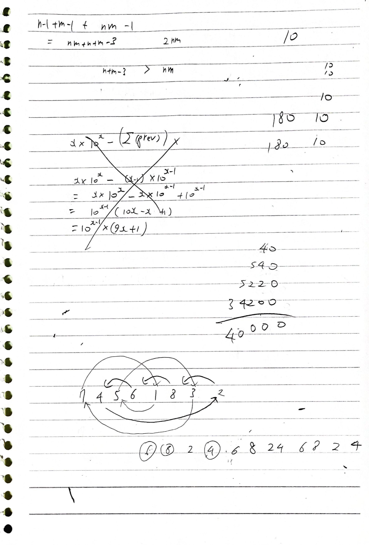 우선 떠오른 생각은 $n$번째 솔루션이 $n - 1$번째 솔루션과 연관성이 있을 것 같다는 것이었다. 예시 입력을 보니, $n=1$일 때의 결과값 $10$이 $n=2$일 때에도 반복되고 있었다. 이에 나는 증명 과정을 건너뛰고, $n - 1$번째 솔루션이 $n$번째 솔루션의 뒷부분이 된다고 가정했다. 그렇다면 $n$번째 솔루션의 첫 항만 계산하면 되는데, 이는 모든 block 길이의 총합이 $n \cdot 10^n$인 것을 이용해 누적합을 적절히 기록하면 된다.