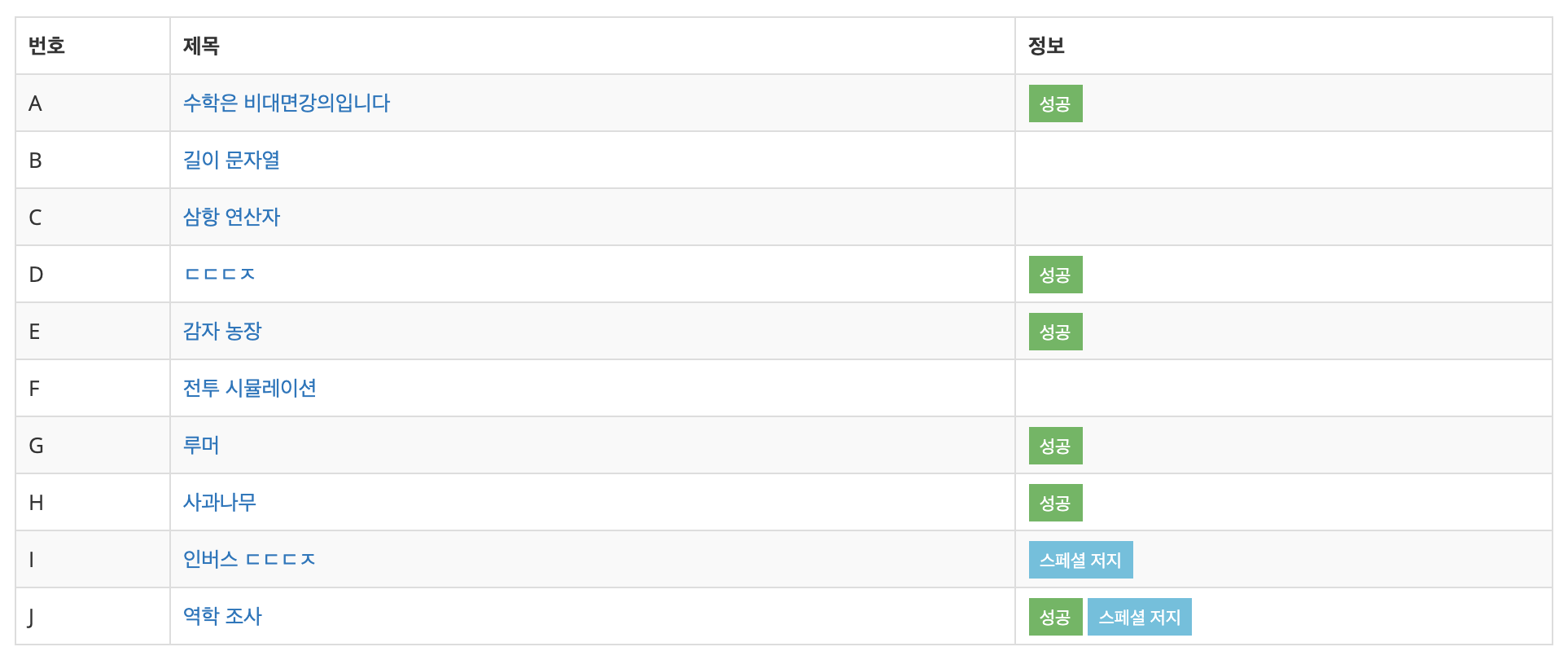 J를 제외한 문제 5개는 대회 문제지를 받아본 3시부터 6시 반까지 3시간 반 동안 설렁설렁 풀었다.