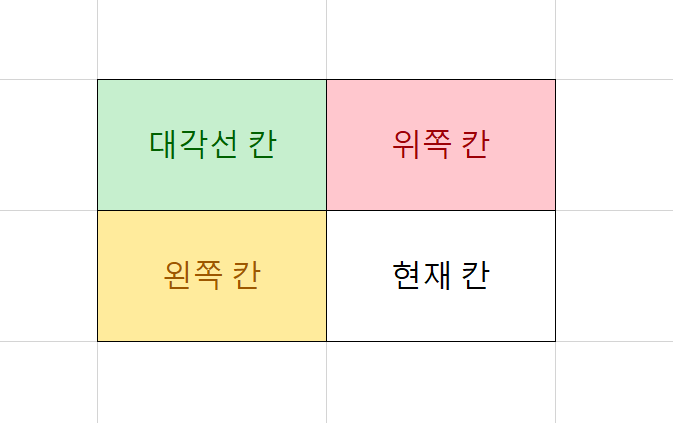 공이 현재 있는 칸에서, 공이 네개의 귀퉁이 중 어떤 귀퉁이에 가까운지를 기준으로 위의 그림처럼 (대칭이동을 통해) 살펴보아야 하는 세개의 칸이 왼쪽/위/대각선으로 오도록 만들어주면 된다는 뜻이다. 그럼 이제 우리의 관심사는 저 세개의 칸 중 어떤 칸에 벽돌이 존재하느냐... 라서 총 8가지의 경우가 존재한다. 왼쪽과 위쪽이 모두 존재할 경우, 대각선 위치에 벽돌이 존재하는지는 사실 중요하지 않고, 또 아무 벽돌도 존재하지 않는 경우도 trivial하므로 경우가 2가지 줄어 총 6가지로 줄어들긴 한다. 아무튼 이렇게 공의 현재 칸만 확인해서, 좌표의 원점을 위 그림에서 현재 칸의 왼쪽 위 귀퉁이로 설정한다면 6가지 경우에 대해 항상 같은 연산을 통해 충돌 여부와 교점 / 튕겨나가는 방향 등을 계산할 수 있다. 공이 어떻게 튕기는지를 확인하였다면, 다시 대칭을 시켜준 후에 현재 칸의 위치에 맞게 평행이동까지 해주면 된다(정확히 이렇게 짜지는 않았을 수도 있다; 기억이 잘 안난다. 아니 이틀 전에 짜놓고??).